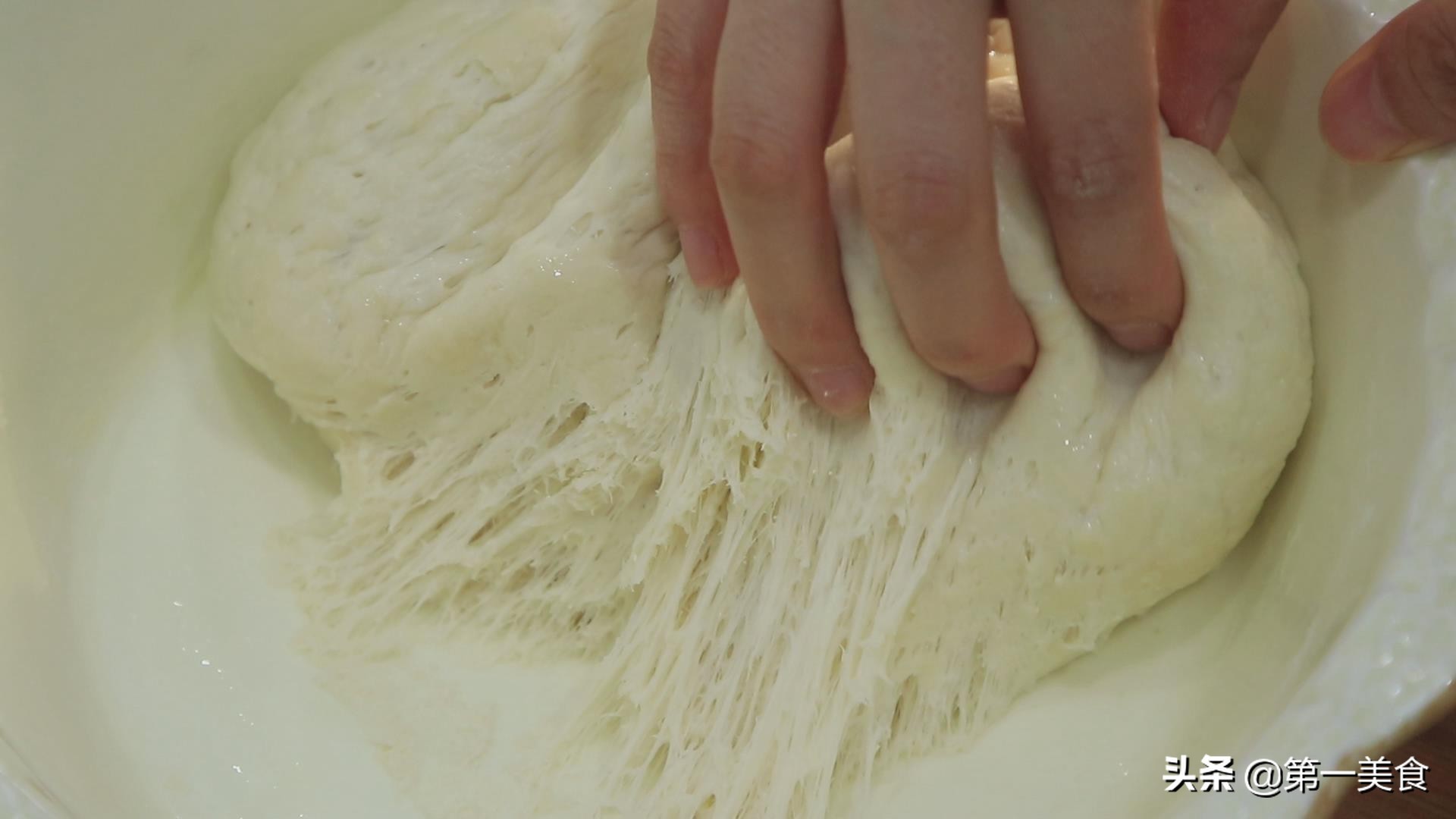 40分钟以后,面团已经发酵好了,用手扒开面团看一下,里面呈蜂窝状,能看到面团里面有许多小孔。