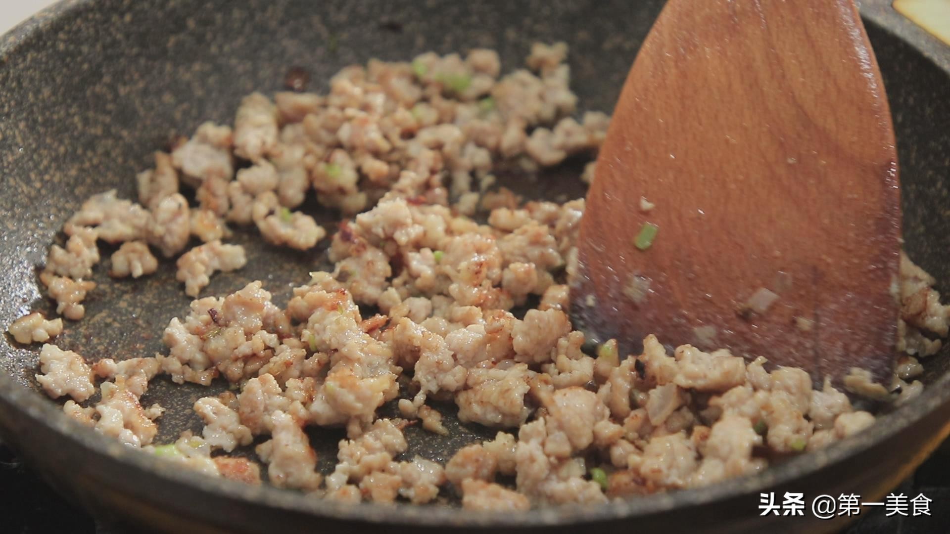 再用同样的方式把准备好的肉末炒一下,炒至肉末断生,加入食盐2克,把肉末炒香倒在盆中 。