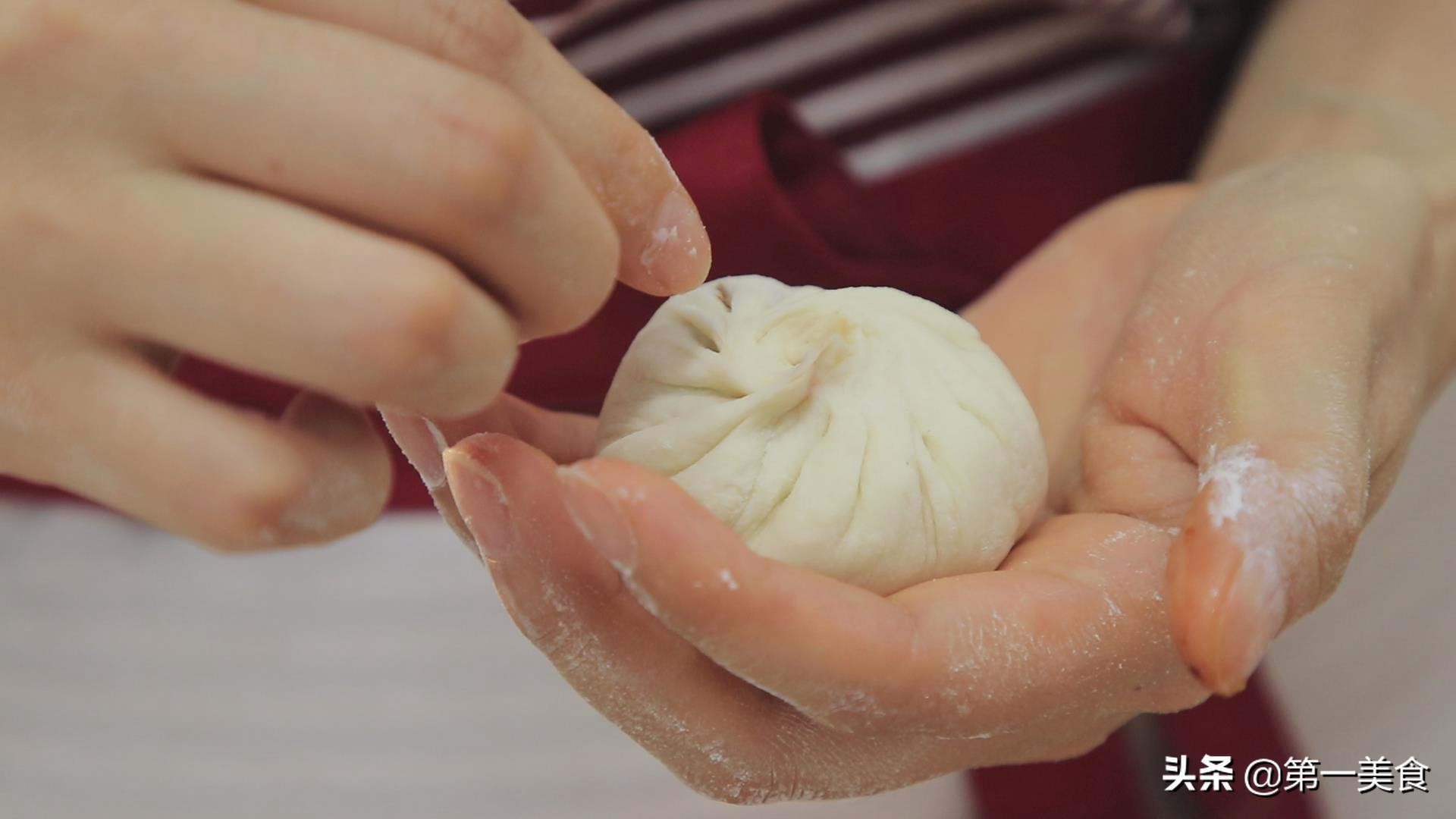 掂起面皮一个边,包好馅料,包成包子。