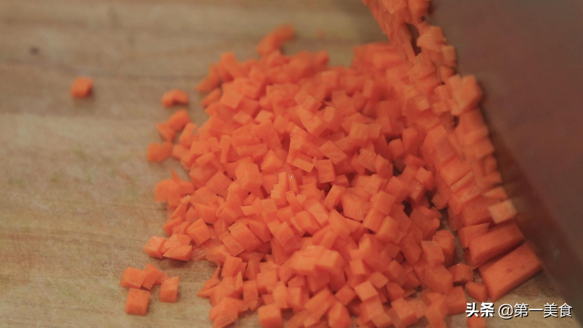 在等待的这个时间段 我们准备做包子的馅料。胡萝卜先切成丝,再切成粒。