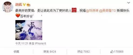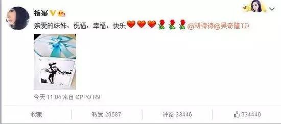 然后,刘诗诗的好姐妹杨幂也在微博上送出了祝福。