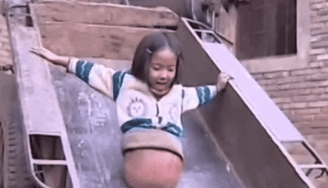 虽有着一副与常人不同的篮球身体,但她却可以灵活的在一个简陋的滑滑梯上玩耍。