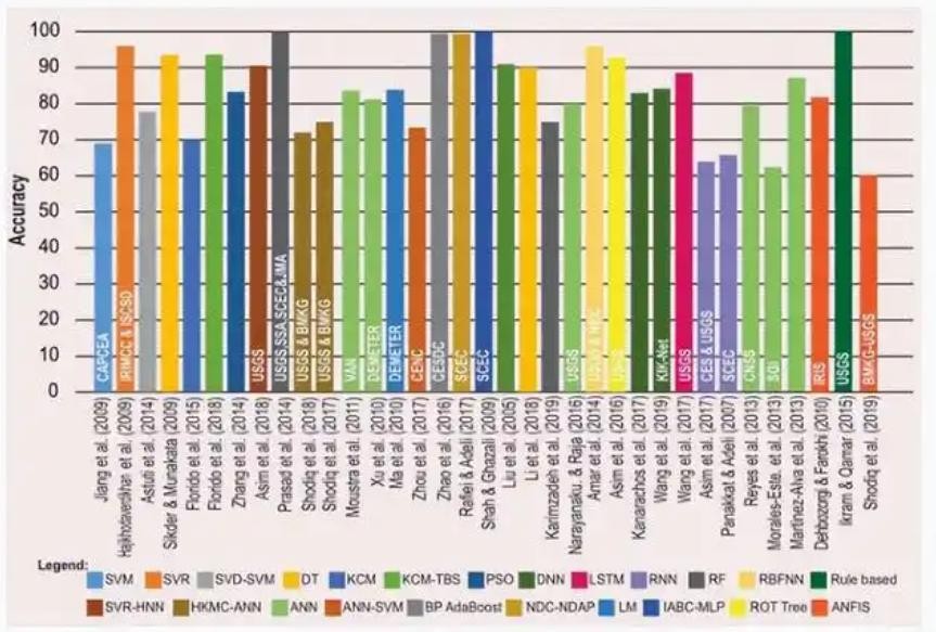 不同研究的地震预测性能比较(每个条棒的高度代表它的准确率)