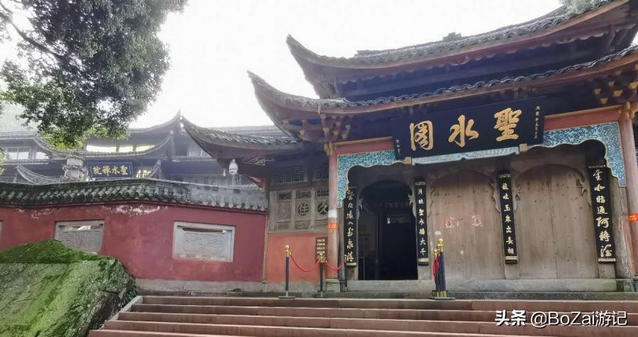 圣水禅院距纯阳殿约1000米,禅院集早些的神水阁和大峨寺为一体,现有五重殿宇,全为木质结构。该禅院原为明代安庆巡抚吴用先的旧居,因周围“修竹万竿”,有“水竹色相绕,碧花动轩楹”(唐,孟郊《旅次洛城东水亭》)的意境,取名“水竹居”。明万历末年(约1619年),因水竹居前有“玉液”神水,遂改宅为寺,名“神水庵”。寺院前有一塔,传为隋代智者大师衣钵塔。