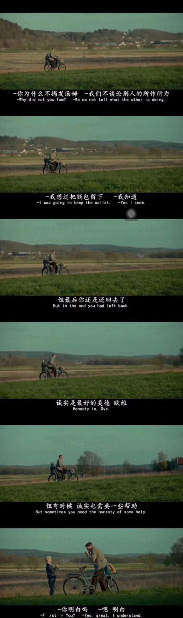 欧维的原则值得我们佩服,他的坚守与善良值得我们学习,他的温柔藏于细腻,在于索尼娅第一次约会时没有说出她迟到的一刻钟,在晚餐时告诉索尼娅在家里吃过了,因为这样可以让索尼娅随便的点餐,讨厌小区的猫却阻止别人伤害,看见邻居不会装的洗碗机主动装上并打扫的整洁光亮,自杀时看见年轻的驾驶员不想让别人产生阴影而放弃,为了让不安邻居学好车主动下车与别人争执。整部剧充满着细腻与温柔,忧郁气息的蓝色构调,黑色幽默诙谐的温馨回忆,正如影名一样带有喜剧气息的吸引人,正如归类喜剧却潸然泪下,正如所说的喜剧中的欢乐是为了让人笑,而悲剧中的欢乐是为了让人在结尾时悲伤加倍,也正如此影片只被奥斯卡最佳外语篇提名而未获奖,但瑞典最高票房足以证明《一个叫欧维的男人决定去死》这部影片深入人心,是一部值得品味的佳作。