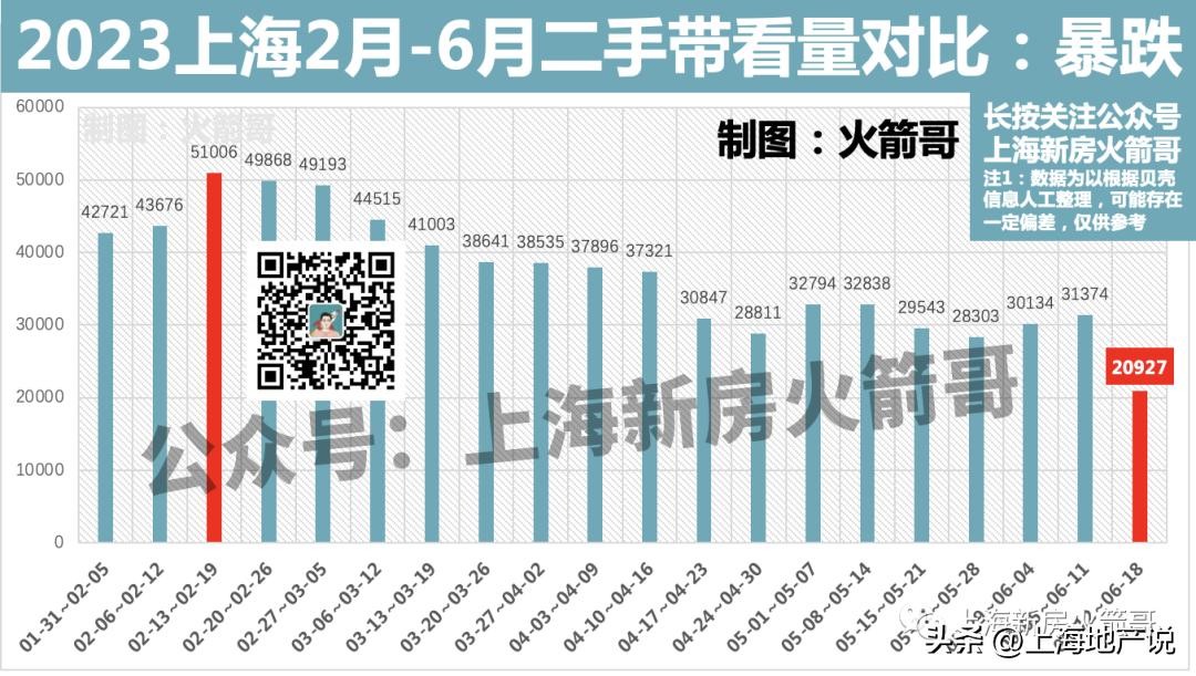 根据贝壳带看量数据显示,当下上海二手房市场周度带看量呈明显下滑趋势,从2月下旬5.1万组/周,到6月第三周已经下滑至2万组/周,相比年初最高峰爆跌150%。