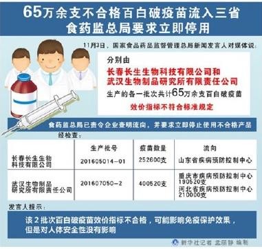 原国家食品药品监管总局官网2017年11月3日发布的信息显示,除了长春长生,武汉生物制品研究所有限责任公司生产的批号为201607050-2的百白破疫苗效价指标也不符合标准规定。