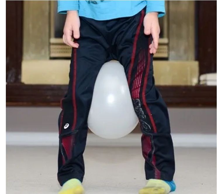 如果夹球往前跳能做到,再试一下夹着球往前走。这样走起来一摇一摆地看起来像个企鹅。