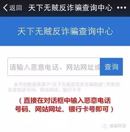 就在去年,首都网警开通了网警微信“反诈骗查询举报平台”。通过这个平台可以查询可疑的电话号码、短信、网站、银行账号等,还可以举报网络诈骗犯罪线索!让我们奔走相告,拿起自己的“武器”,对网络诈骗犯罪说“No”。