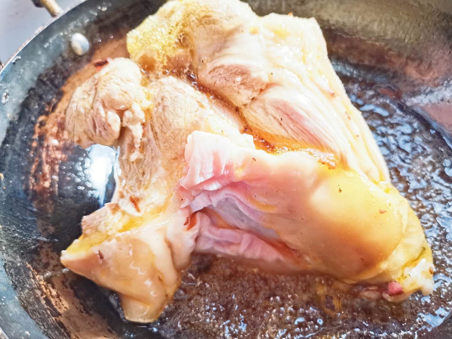 大锅加热烧油,这一步需要炸制,所以油量是锅里的1/4-1/3处,油温8成热的时候放入肘子。因为肘子体积比较大,在炸制一面的同时,另外一面也要用勺子淋油,使其两面受热。炸制一分钟后翻面,每一面都要炸到。这一道工序比起其他的用焯水去腥略显繁琐一些,但是炸制过的肉香味儿也是独具一格。