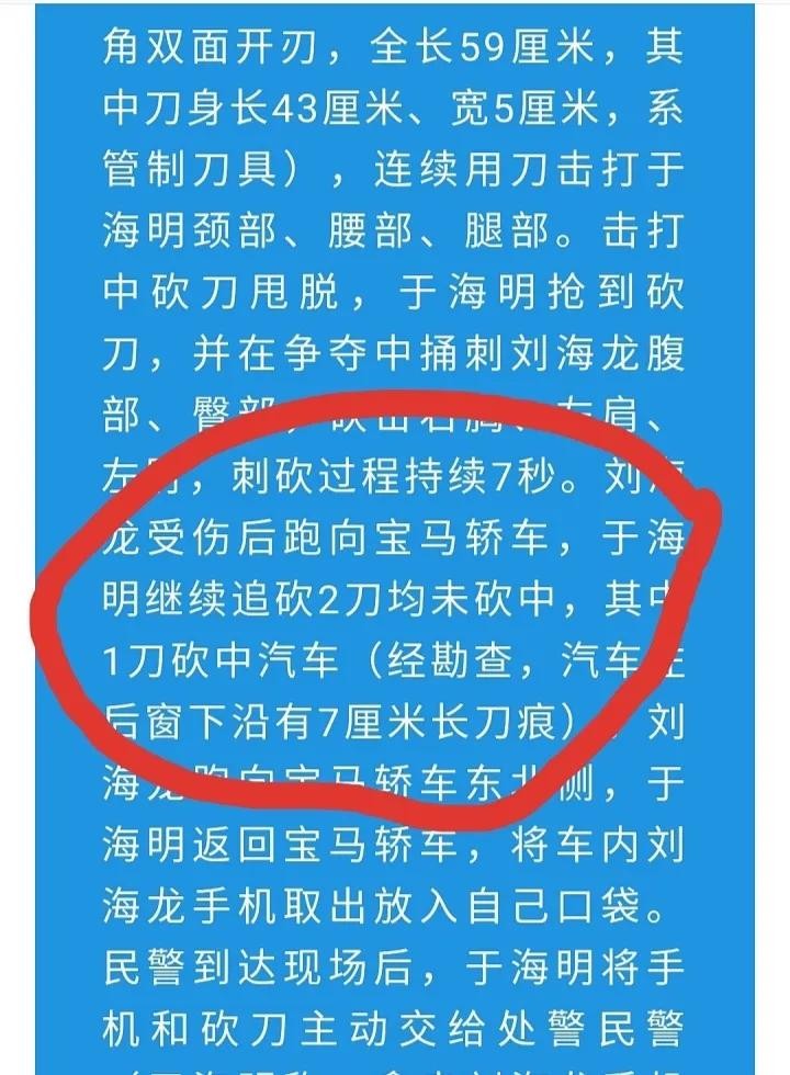 “龙哥”被120急忙拉走抢救,被警察带走的于海明这时也稍微缓了过来,便向家人诉说了经过,家人都为他捏了一把汗。