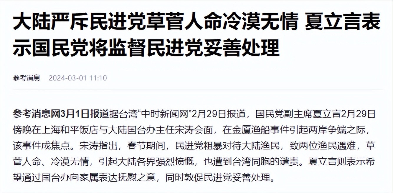 参考资料:参考消息——大陆严斥民进党草菅人命冷漠无情 夏立言表示国民党将监督民进党妥善处理