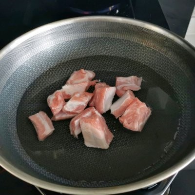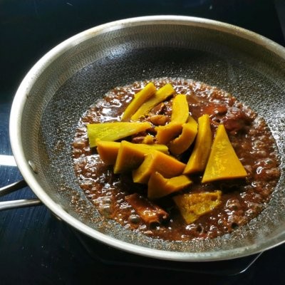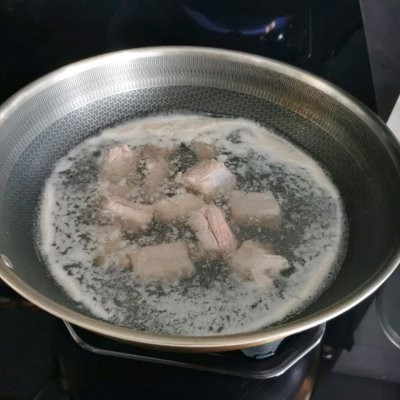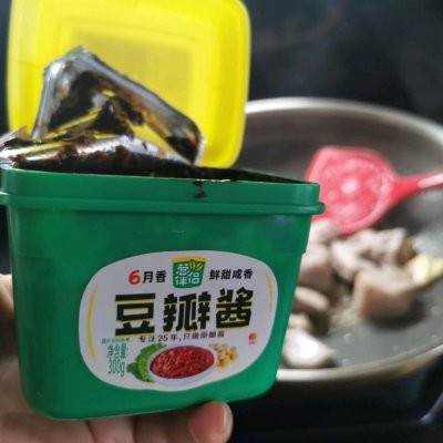 排骨一定要冷水下锅可以更好的去除血水 加入6月香豆瓣酱,在味道上能更加增鲜提香。 最后加入南瓜,南瓜挺括有型
