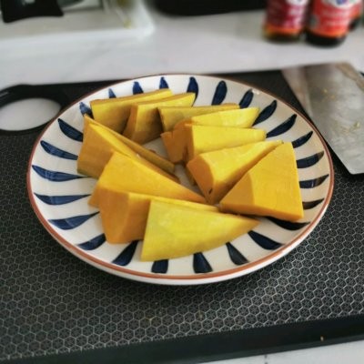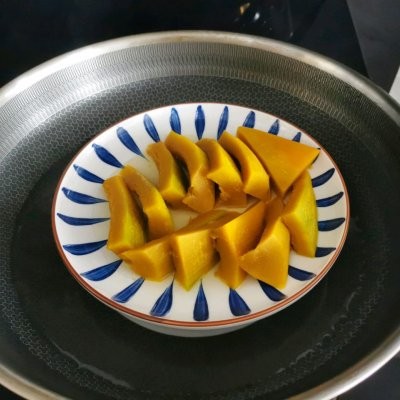 3、锅中烧水,水开后南瓜隔水蒸6分钟。(贝贝南瓜蒸4分钟够了)。拿出备用