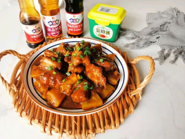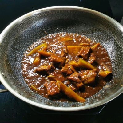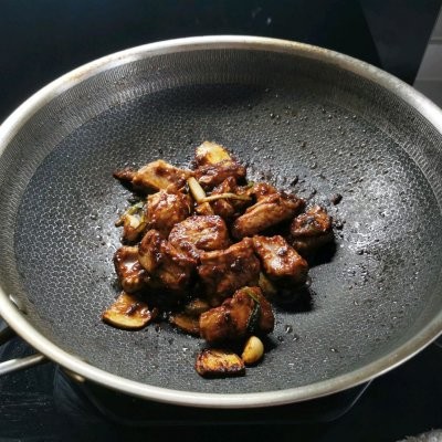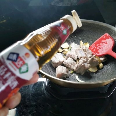 9、酱料和排骨提前翻炒均匀,能让排骨更好的入味倒入