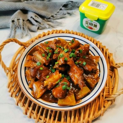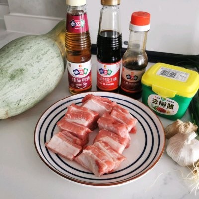 新疆贵族南瓜 300克排骨 350克料酒 45克生抽 6克老抽 3克6月香豆瓣酱 3勺水淀粉 15克大蒜头 半个食用油 2勺小葱 1把生姜片 少许
