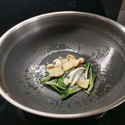 6、开中火,锅中加入2勺食用油,油温五成热时,下葱姜蒜爆香