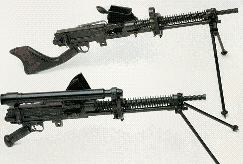 又是日本的,这款枪可以说是“为了简单而麻烦”。为了可以和三八大盖使用同一种弹夹供单,采用了一种漏斗式的供弹机。由于工作复杂,故障率极高。由于供弹机在左侧,瞄准具在右侧,这样使得无论左右手使用都无法舒服的瞄准。两脚架也较高,使得平射和俯射都要直起身子,这在战场上是十分危险的。重量过重造型奇特的歪把子在携带方面也是十分麻烦的