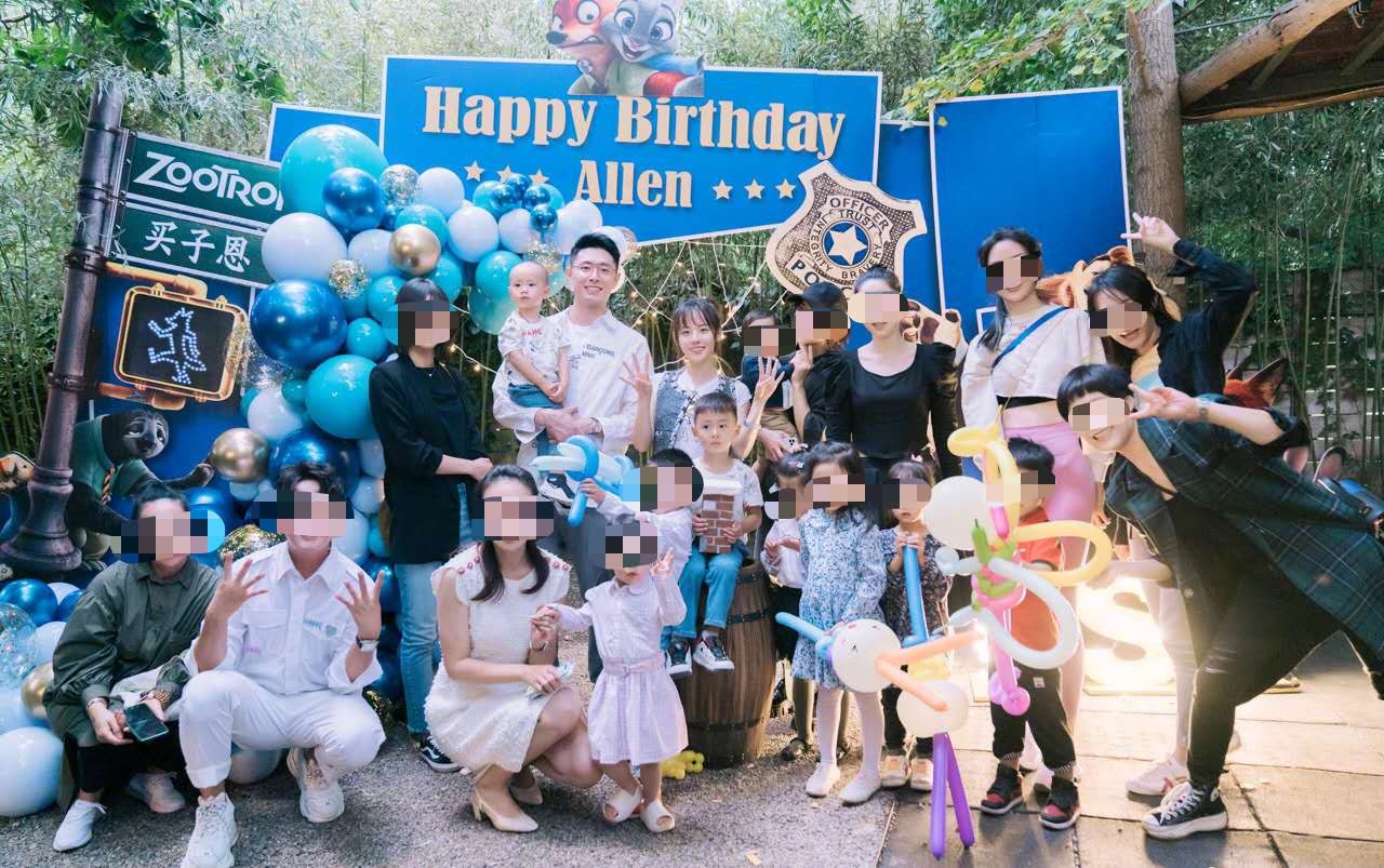 另外,儿子的生日派对整体布置也是吸引了很多人的目光,整体为蓝色系,用《疯狂动物城》的元素搭起了"生日快乐"的牌子,还有写着儿子名字的立牌,一大束很高级的气球十分好看。而且还来了很多好友和小朋友一起庆生,很有仪式感。