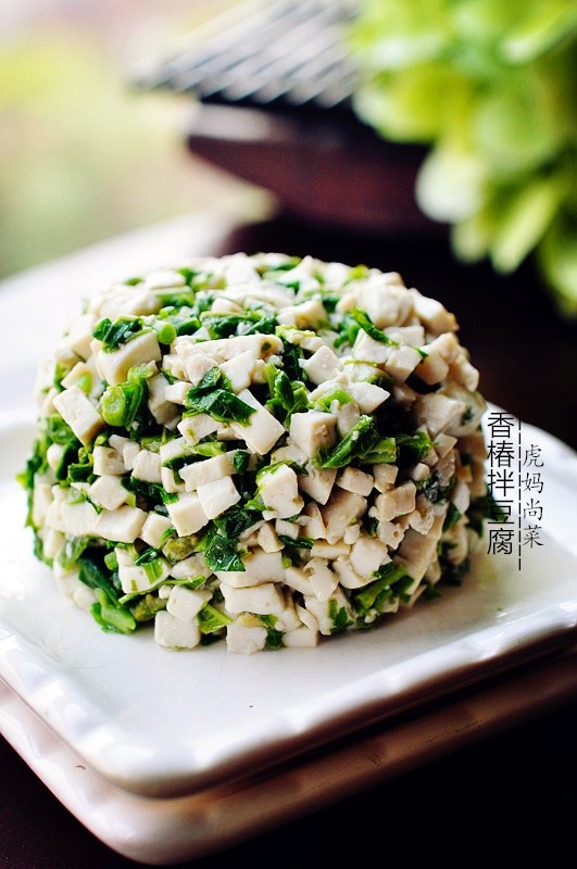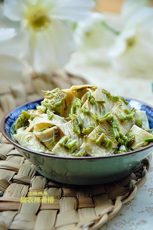 材料:香椿75克,豆腐140克,盐2克,山茶籽油15克。