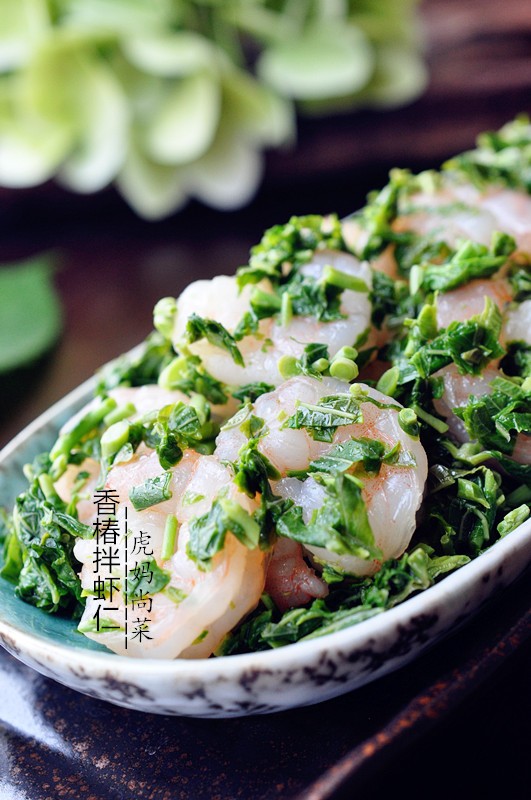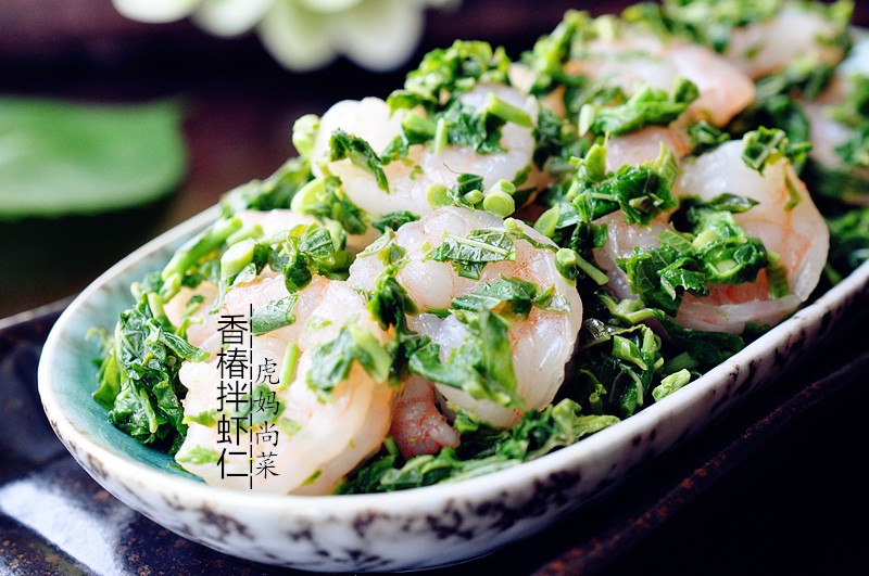 烫一烫,拌一拌即成,要让香椿碎包裹着虾仁,一起入口,嚼起来才够味。