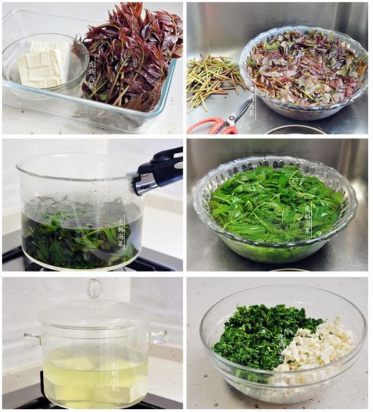 做法:1.香椿剪去老枝洗净,水开后放入焯烫至变色即可。