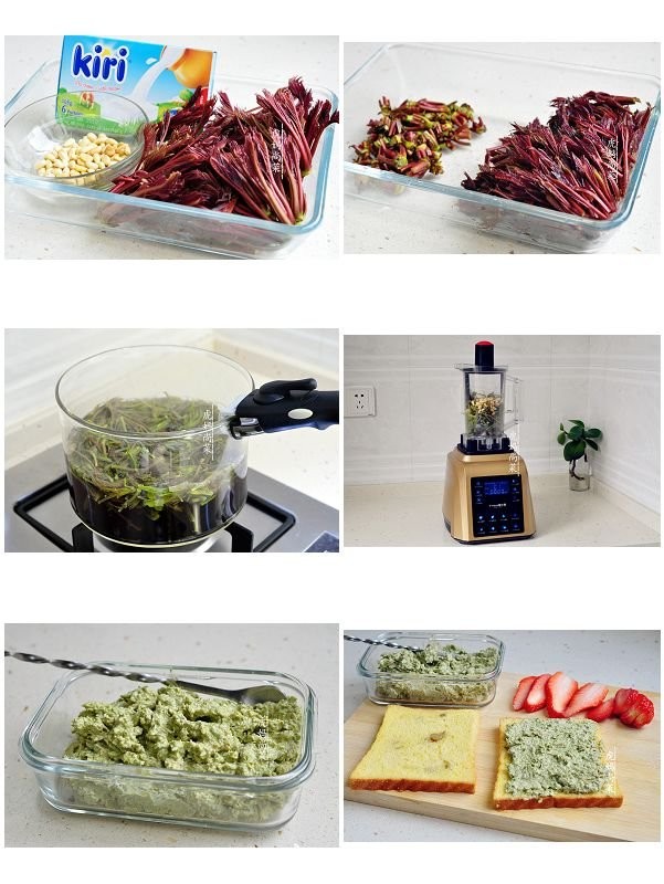 材料:香椿芽200克,松子仁30克,奶油奶酪60克,盐2克。