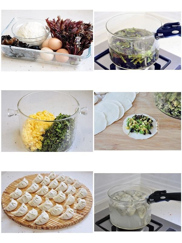 饺子馅料:香椿芽150克,泡发的木耳90克,鸡蛋4个,盐4克,茶树油25克。