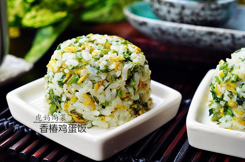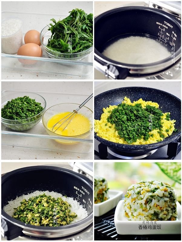 材料:香椿芽158克(烫后的),大米2杯,鸡蛋2个,盐3克。