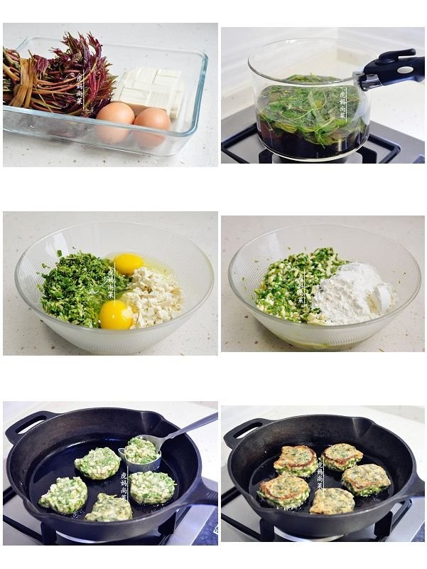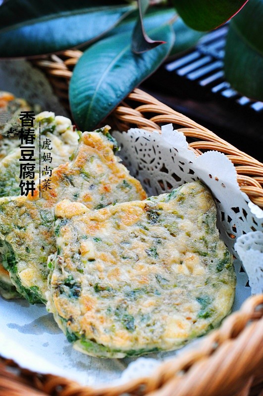 材料;香椿85克(焯烫),豆腐130克,鸡蛋2个,面粉30克,芝麻油10克,盐3克。