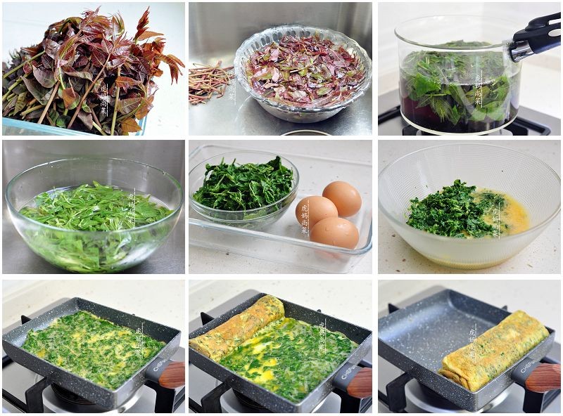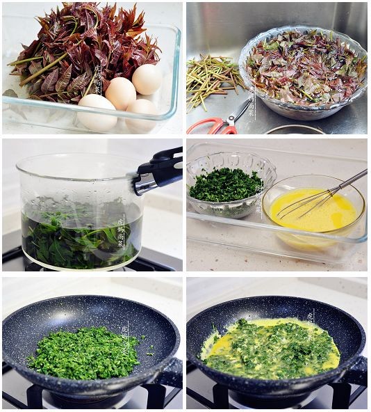 小贴士:焯烫后的香椿一定要洗干净,鸡蛋才不会被染色。