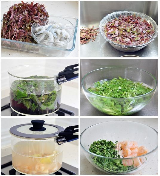 材料:香椿110克,虾仁200克,盐3克,山茶籽油20克。