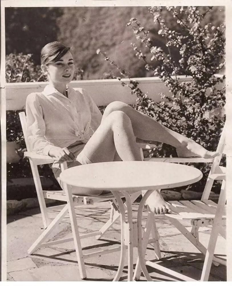 图中赫本在晒太阳,赫本身着清凉表情惬意,露出一双美腿,看起来心情不错。