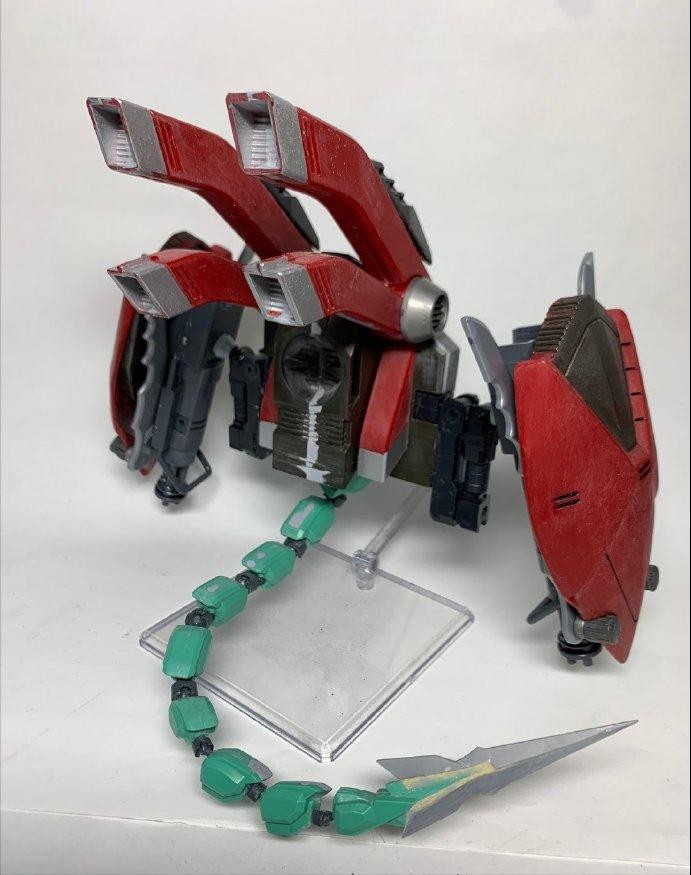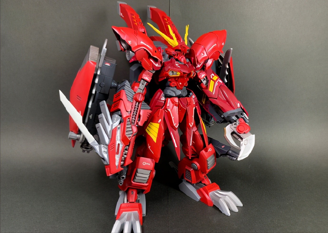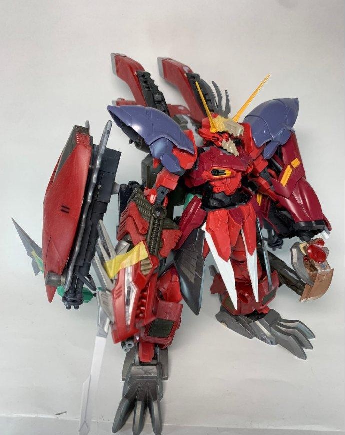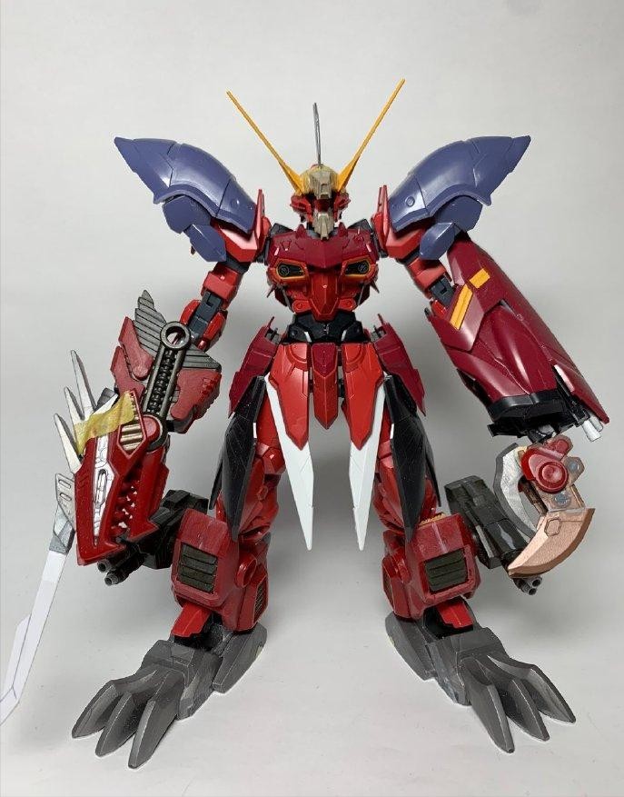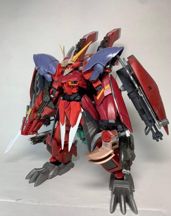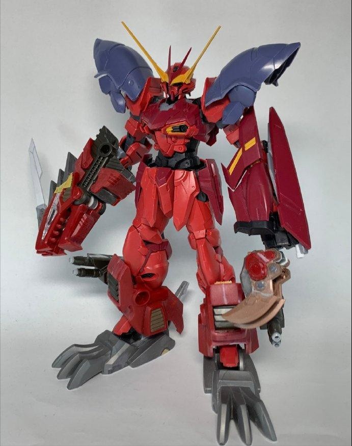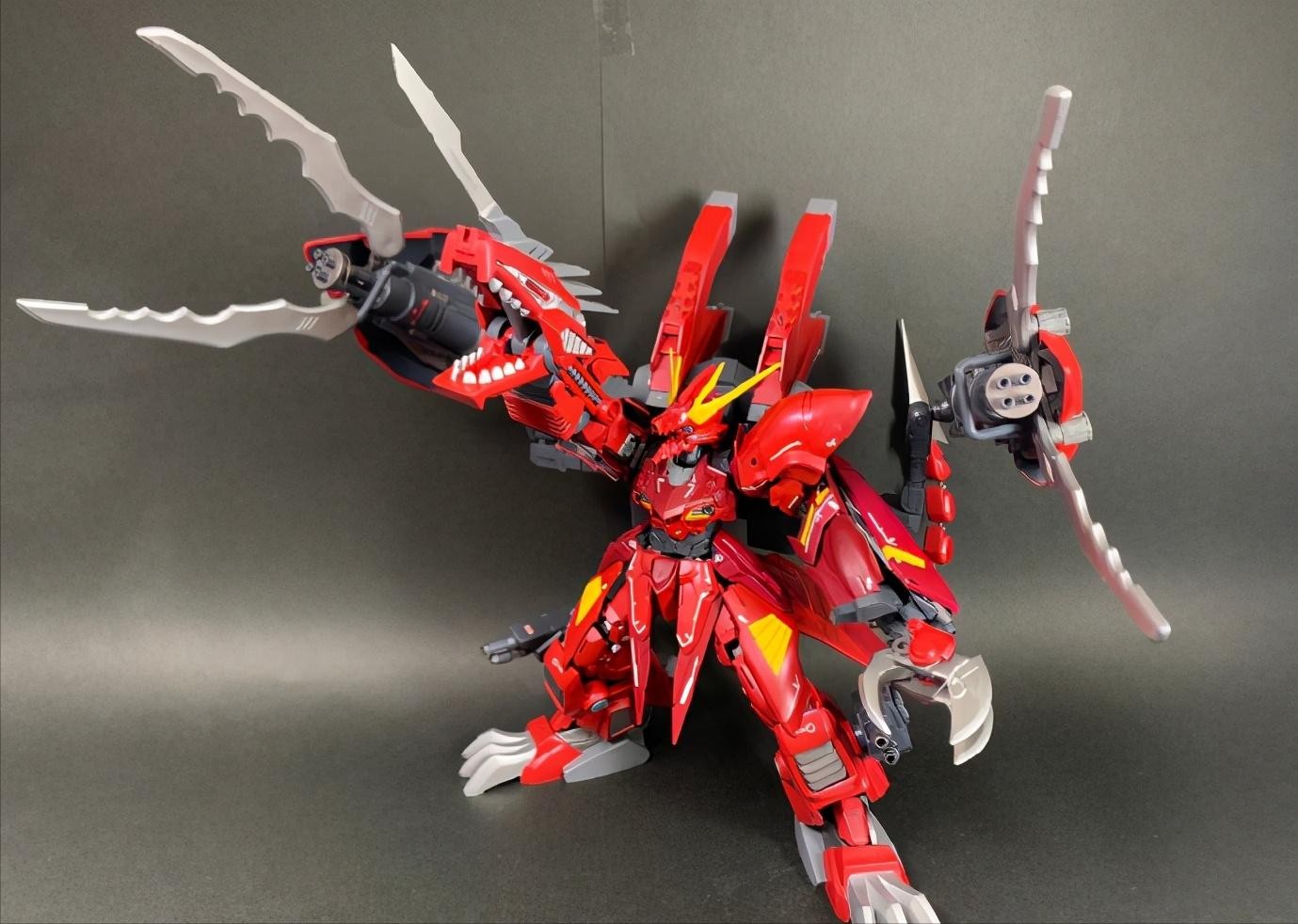 这款模改的圣约高达已经不太好看出原来的样子了,看起来有点野兽战争中角色的样子。四肢改成了龙型的爪子,有一只手臂直接改成了龙头,如果不了解它,还以为这款模型可以变形,不过真要是能变形就更厉害了。