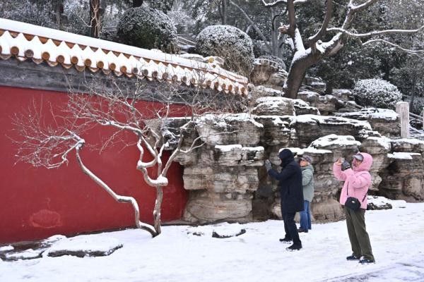 ↑12月11日早晨,人们在景山公园拍摄雪景。新华社记者 李鑫 摄