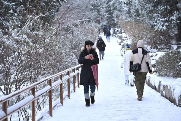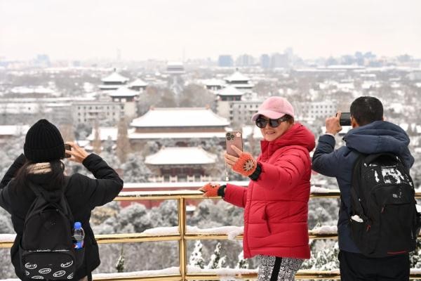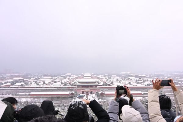 ↑12月11日,游客在景山上拍摄故宫雪景。新华社记者 李鑫 摄