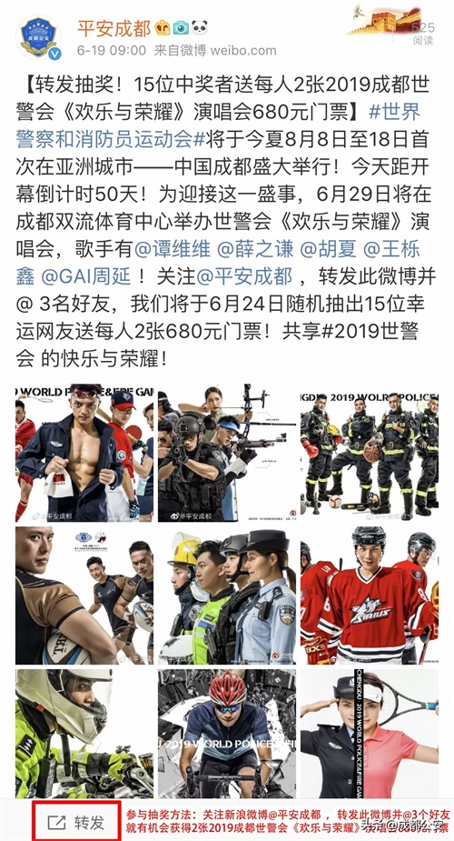 转发海报微博抽奖!15位中奖者送每人2张!2019成都世警会《欢乐与荣耀》演唱会680元门票!