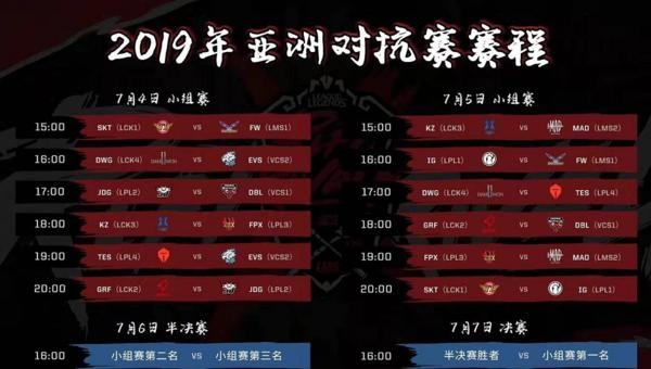 2019英雄联盟洲际赛比赛定于7月4日在韩国首尔的奖忠体育馆P3举行,小组赛阶段将会在7月4日和7月5日进行,比赛从北京时间下午3点开始。半决赛和决赛将会在7月6日和7月7日进行,比赛从北京时间下午4点开始。在本次参赛的12支队伍来自LPL、LCK、LMS、VCS四个赛区,其中LPL赛区4支队伍分别为IG、FPX、TES、JDG;LCK赛区4支队伍分别为SKT、GRF、KZ、DWG;LMS赛区和VCS赛区4支队伍分别为FW、DBL、MAD、EVS。