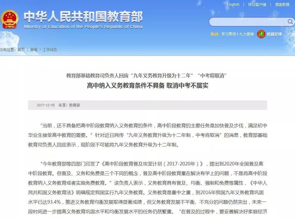 文章中说2020年要取消中考,是教育部的规定,十九大的要求。并提供了以下截图: