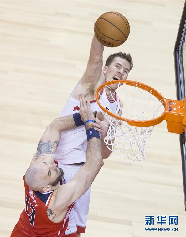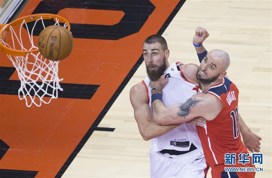 ↑4月25日,猛龙队球员乔纳斯·瓦兰西尤纳斯(上)与奇才队球员马辛·戈塔特在比赛中争抢篮板球。新华社发(邹峥摄)