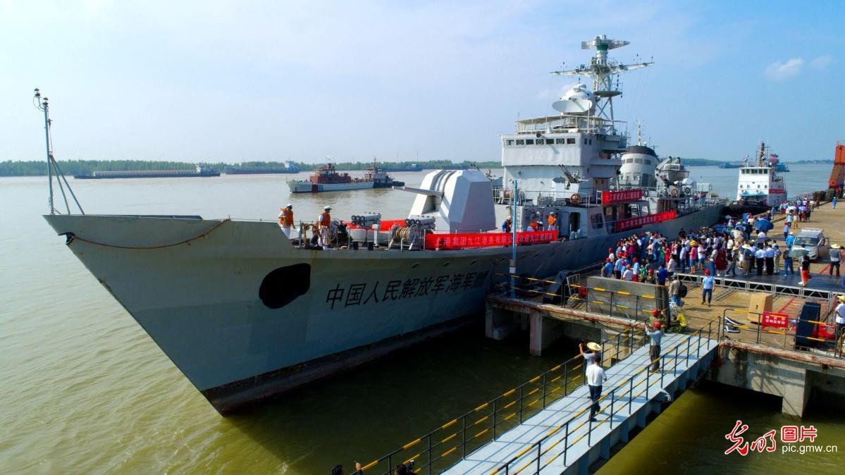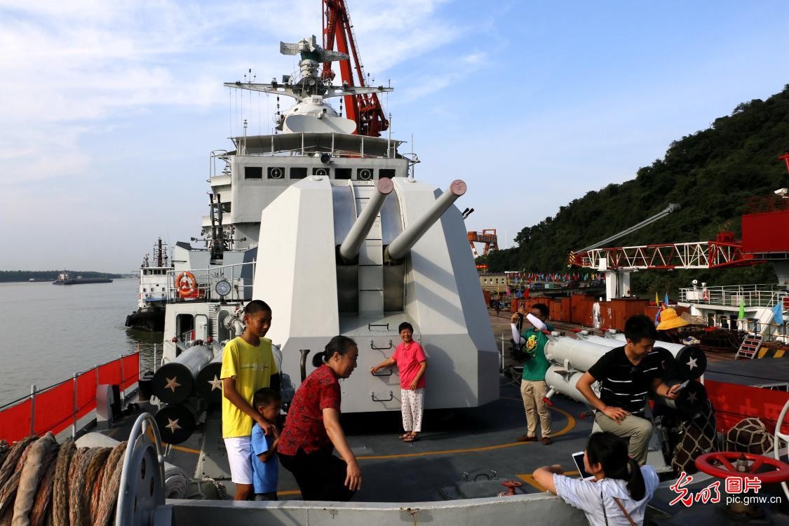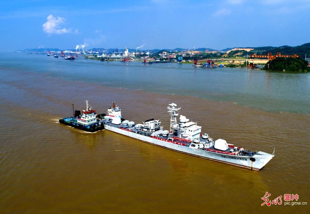 2019年7月20日下午,服役43年的九江舰退出现役后,经过20天的拖行抵达江西九江,将用于当地爱国主义教育基地建设。"九江舰"1975年2月2日于上海沪东造船厂开工建造,是我国自行设计建造的053H(江湖1级)导弹护卫舰。(洪永林摄/光明图片)( 文章来源:光明图片)