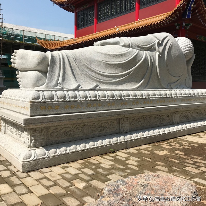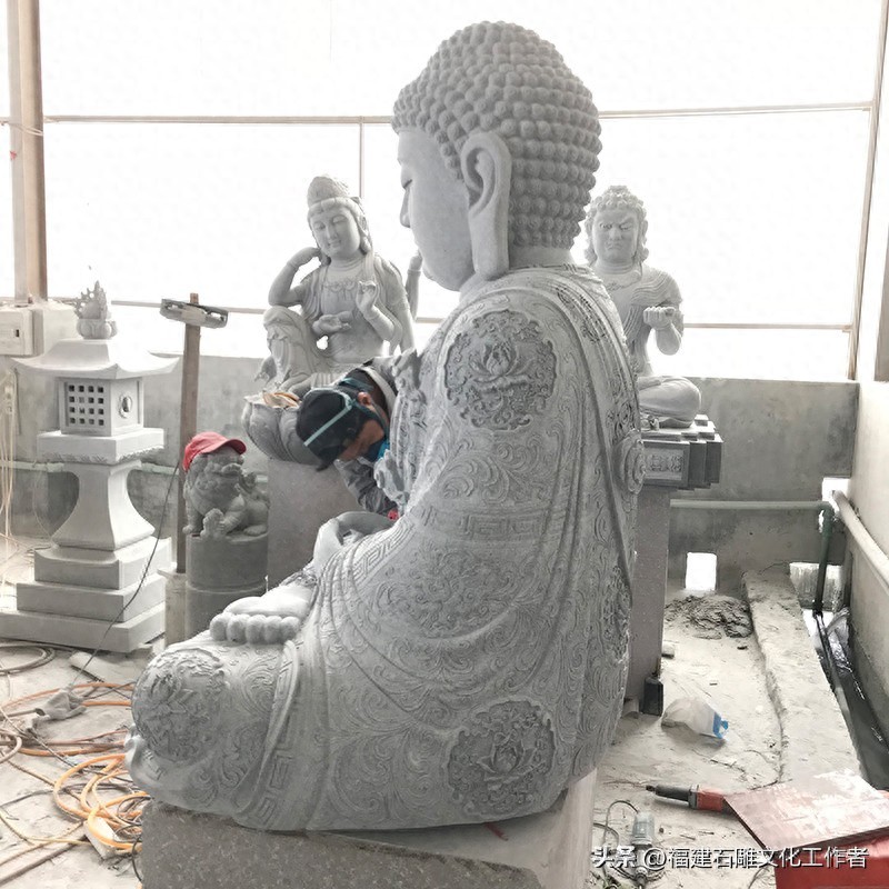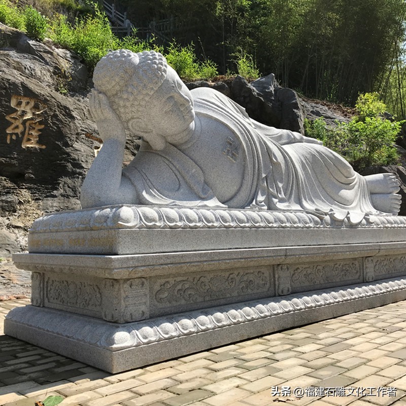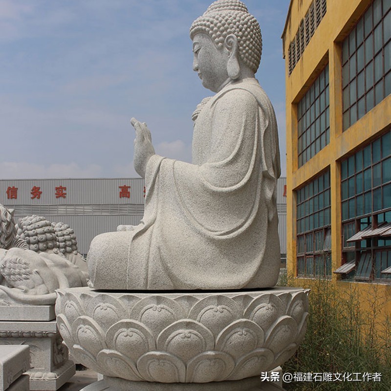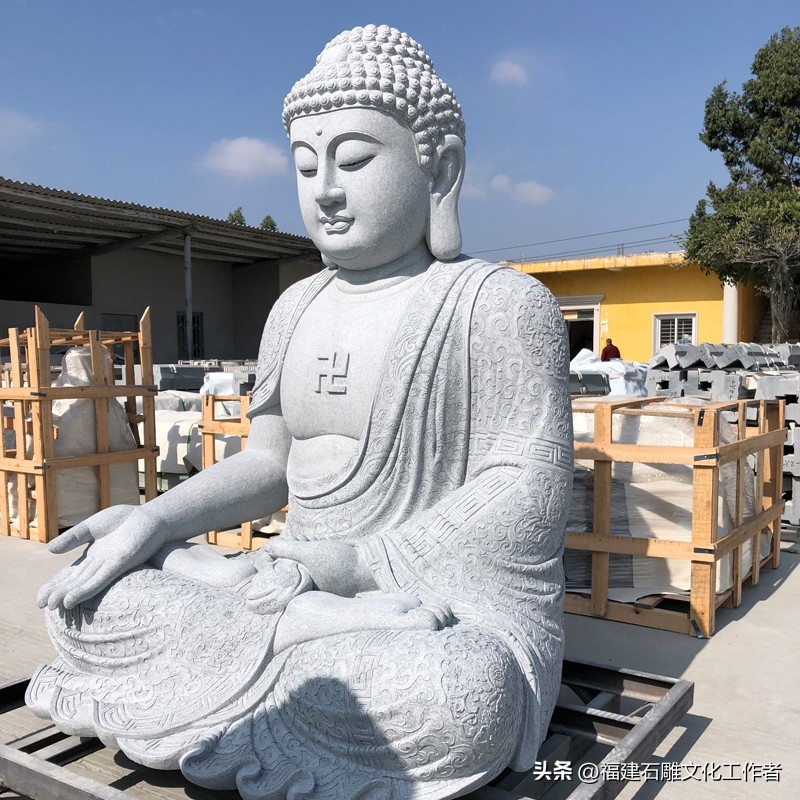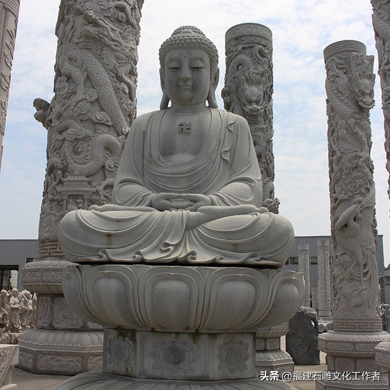 庄严肃穆的石雕如来佛是佛教艺术的重要表现形式,其承载着深厚的宗教文化内涵和精湛的石雕技艺。石雕如来佛祖的形象通常可分为站姿、坐姿和卧姿三种形态。站姿的如来佛石像显得威严庄重,而坐姿的如来佛则多呈跏趺坐(即双腿交叉盘坐于莲花座上),安详的坐姿象征着如来佛内心的平静与稳定。还有一种姿仪叫卧姿,其多呈现涅槃状,表现出一种超脱世俗的宁静与安详。石雕大日如来佛不仅拥有不同的姿仪,还有许多独特的手势,而且都分别蕴含着不同的特殊含义。