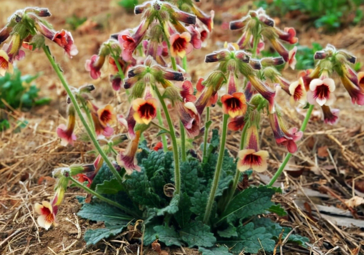 形态特征:体高 10 - 30 厘米,密被灰白色多细胞长柔毛和腺毛。根茎肉质,鲜时黄色。叶通常在茎基部集成莲座状,叶片卵形至长椭圆形,上面绿色,下面略带紫色或成紫红色。花具长 0.5 - 3 厘米之梗,梗细弱,弯曲而后上升,在茎顶部略排列成总状花序,花冠外紫红色,内黄紫色。