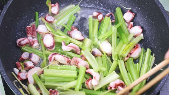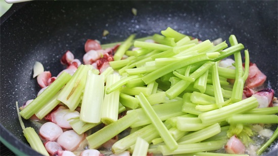 6 把鱿鱼脚炒香之后,加入芹菜段,接着翻炒均匀。