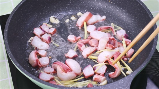5 锅中烧油,油温起,放入蒜末姜丝爆香,接着加入鱿鱼脚,翻炒均匀。