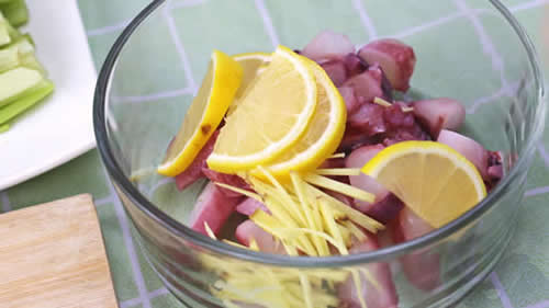 4 再准备一个碗,放入切好的鱿鱼脚,姜丝,还有柠檬片,抓拌均匀,去除腥味。