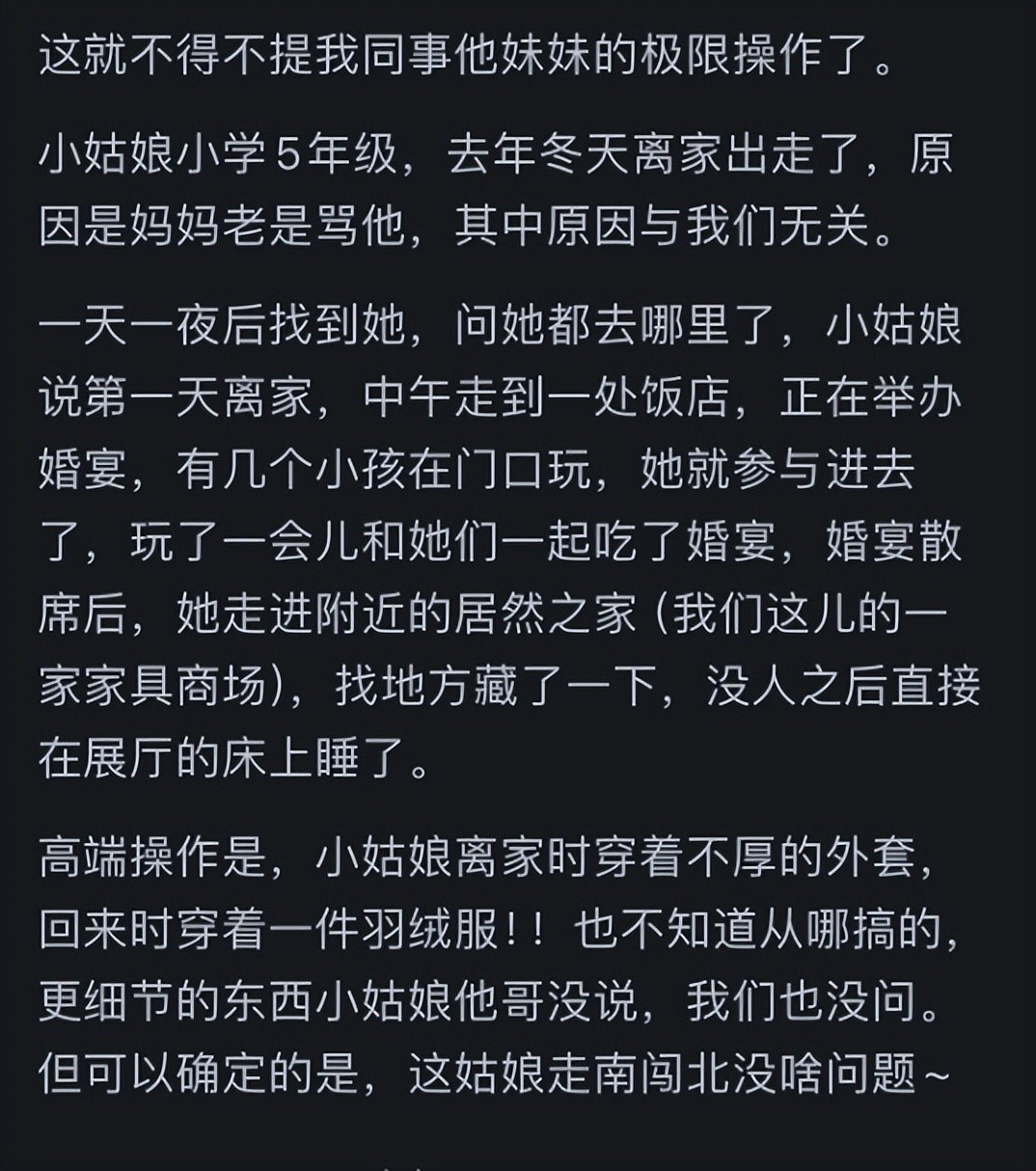 不得不说这孩子的生存能力比我一个成年人还强,哈哈哈哈。