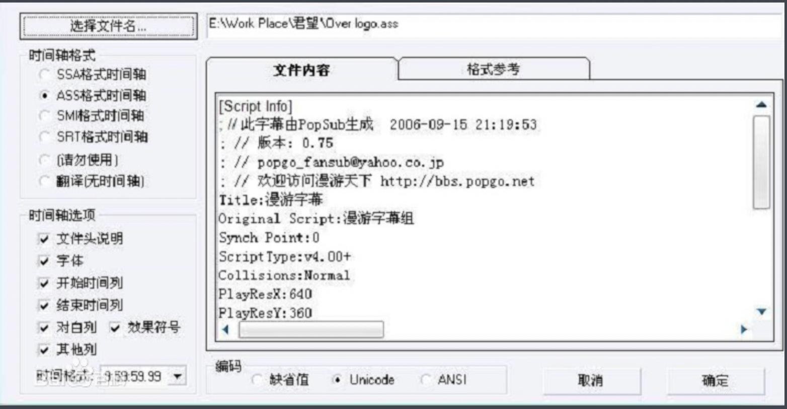 3、ASS格式,是一种文件格式,是大多数字幕制作者所公认的并且经常使用的字幕格式。