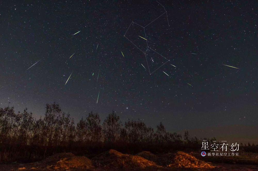 黑龙江省天文摄影爱好者刘成山 2025 年 10 月 21 日在大庆市拍制的猎户座流星雨(多张叠加)。(本人供图)