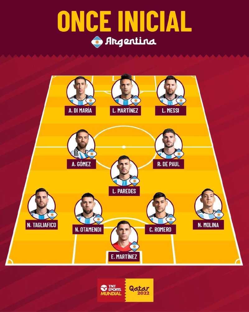 23-马丁内斯、3-塔利亚菲科、19-奥塔门迪、13-罗梅罗、26-莫利纳、17-A·戈麦斯、5-帕雷德斯、7-德保罗、11-迪马利亚、22-劳塔罗、10-梅西。